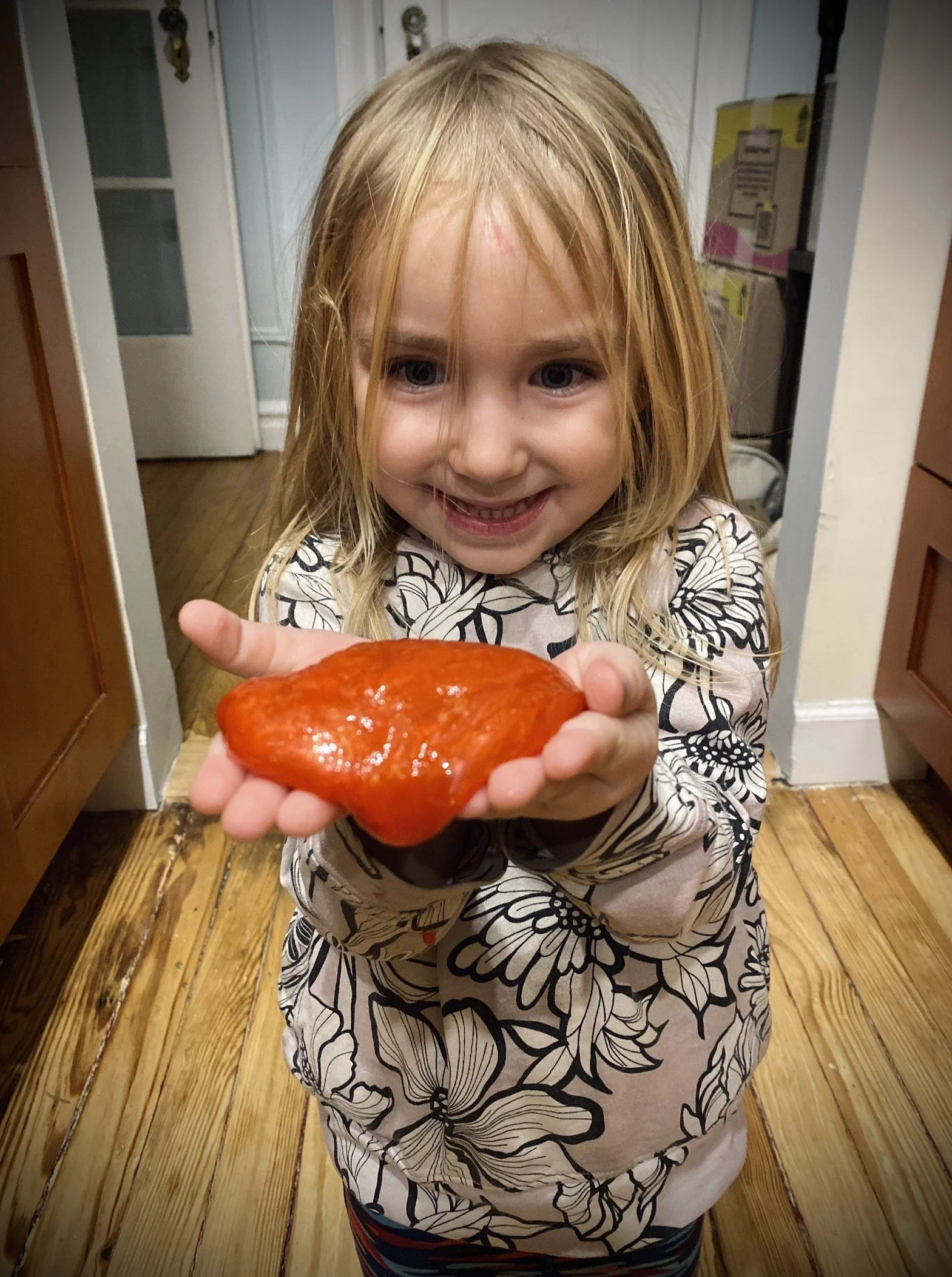 Now my daughter twirled through the apartment with the beginnings of a reproductive agenda, the red slime in a repurposed take-out container, like a misplaced sacrament. There used to be Lashevet’s babaganoush in there. From Eggplant to egg sustainer.